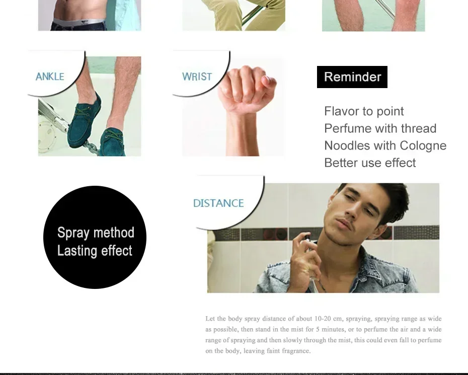 About 20 cm away from the body, spray the perfume evenly and fall on the body's wrists, behind the ears, on the side of the neck, on the collarbone and other parts of the body with high temperature, and the aroma will naturally spread with the body temperature.